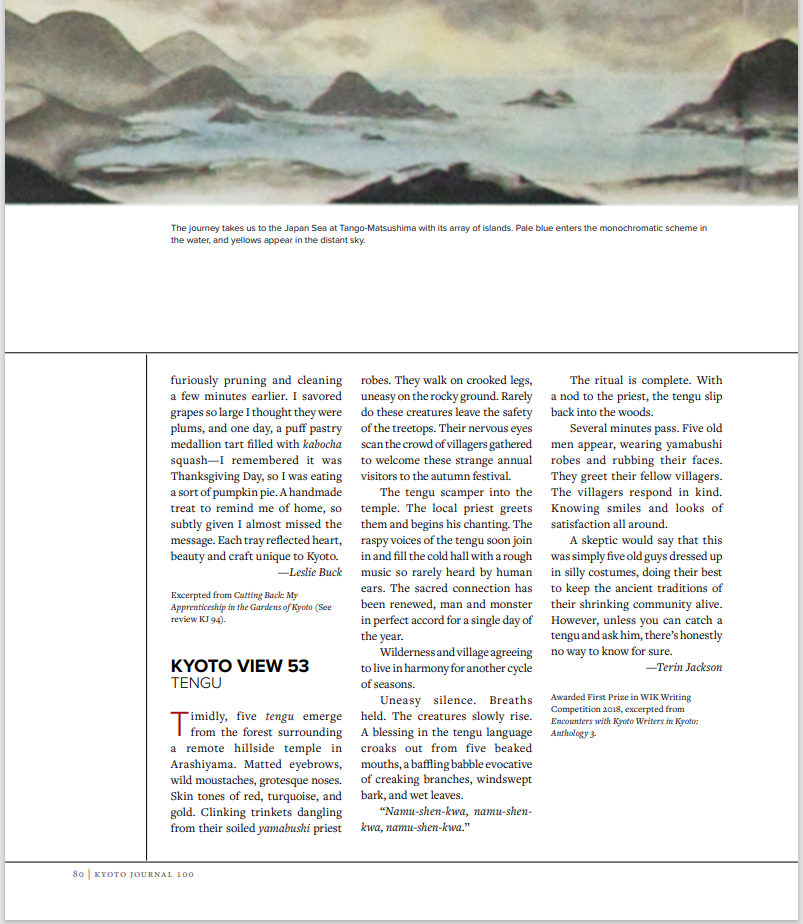 This short narrative piece won first prize in the third annual Writers in Kyoto 2018 Writing Competition, and was featured in the Kyoto Journal 100 Anniversary print edition.